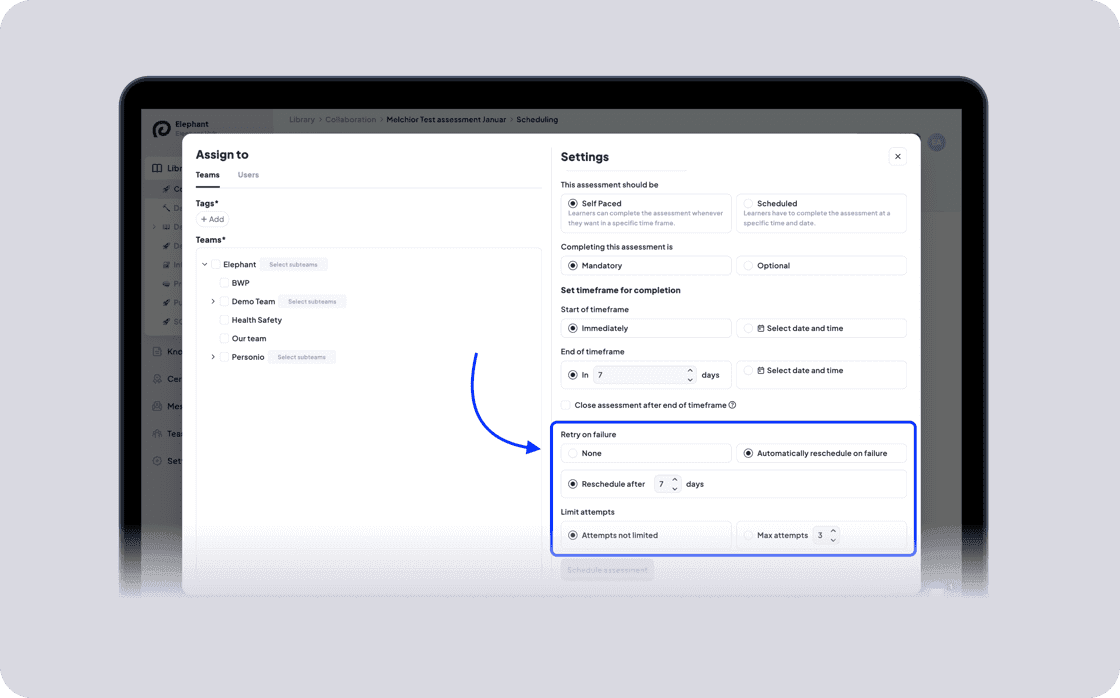 Perfekt für skalierbare Schulungen, Compliance-Prozesse und alle Szenarien, in denen Lerner mehrere Versuche benötigen – ganz ohne zusätzlichen Admin-Aufwand.